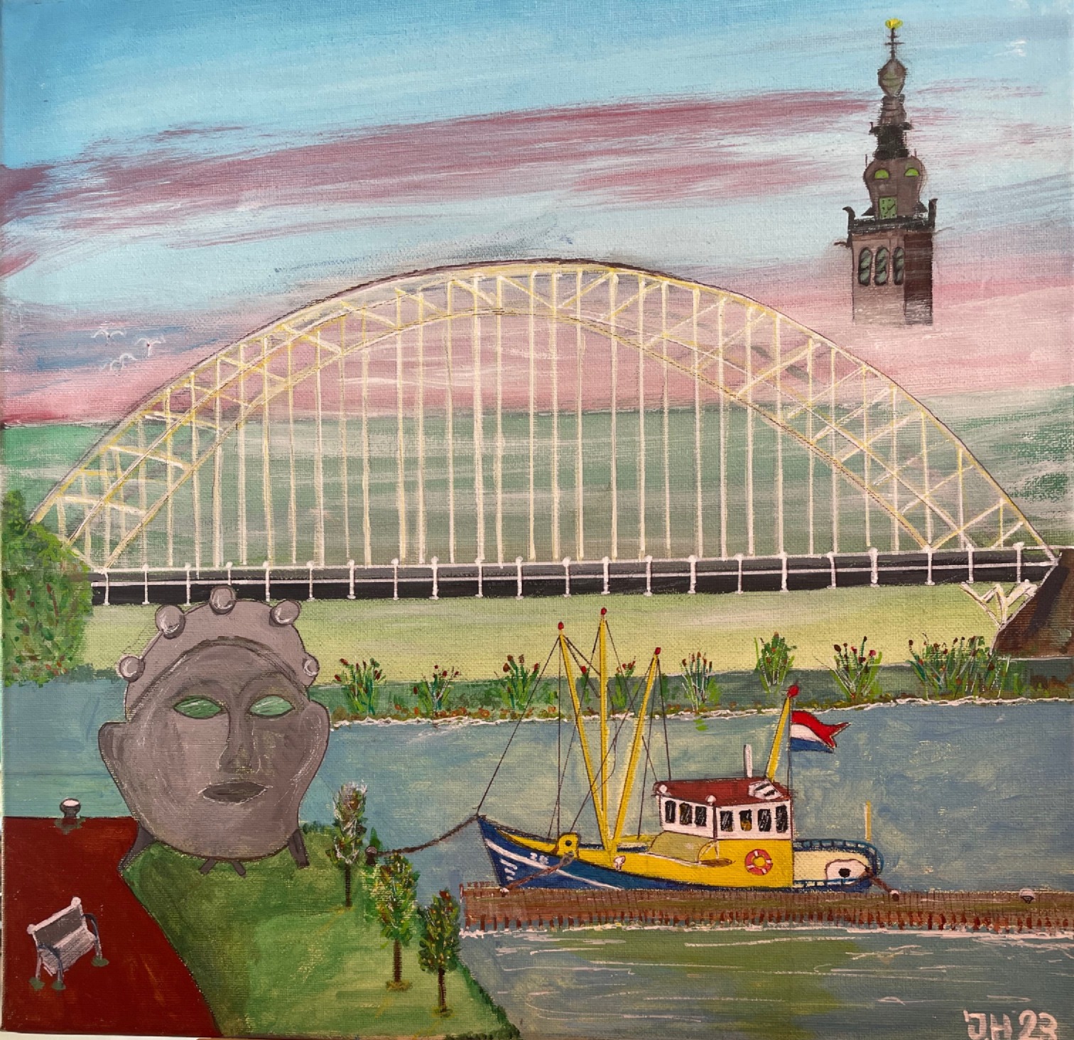 Titel werk: Mijn stad Nijmegen met de Waalbrug het Romeinse masker en de garnalenkotter van Maarten. Materiaal: Acryl op doek.