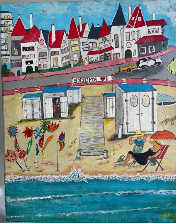 Titel werk: Knokke, mijn favoriete badplaats. Met de papieren bloemen door de kinderen gemaakt en die worden geruild met bepaalde schelpen die zaagjes of couteautjes genoemd worden. het valt zelfs onder immateriaal erfgoed van Vlaanderen